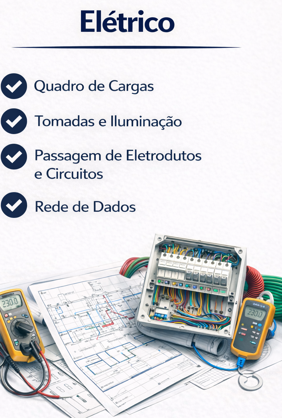 O Projeto Elétrico define toda a instalação da sua residência, incluindo pontos de iluminação, tomadas, dados (TV, internet e telefone) e fiação. Ele apresenta o dimensionamento correto, legendas claras e o quadro de cargas com todas as informações necessárias para a execução da obra.