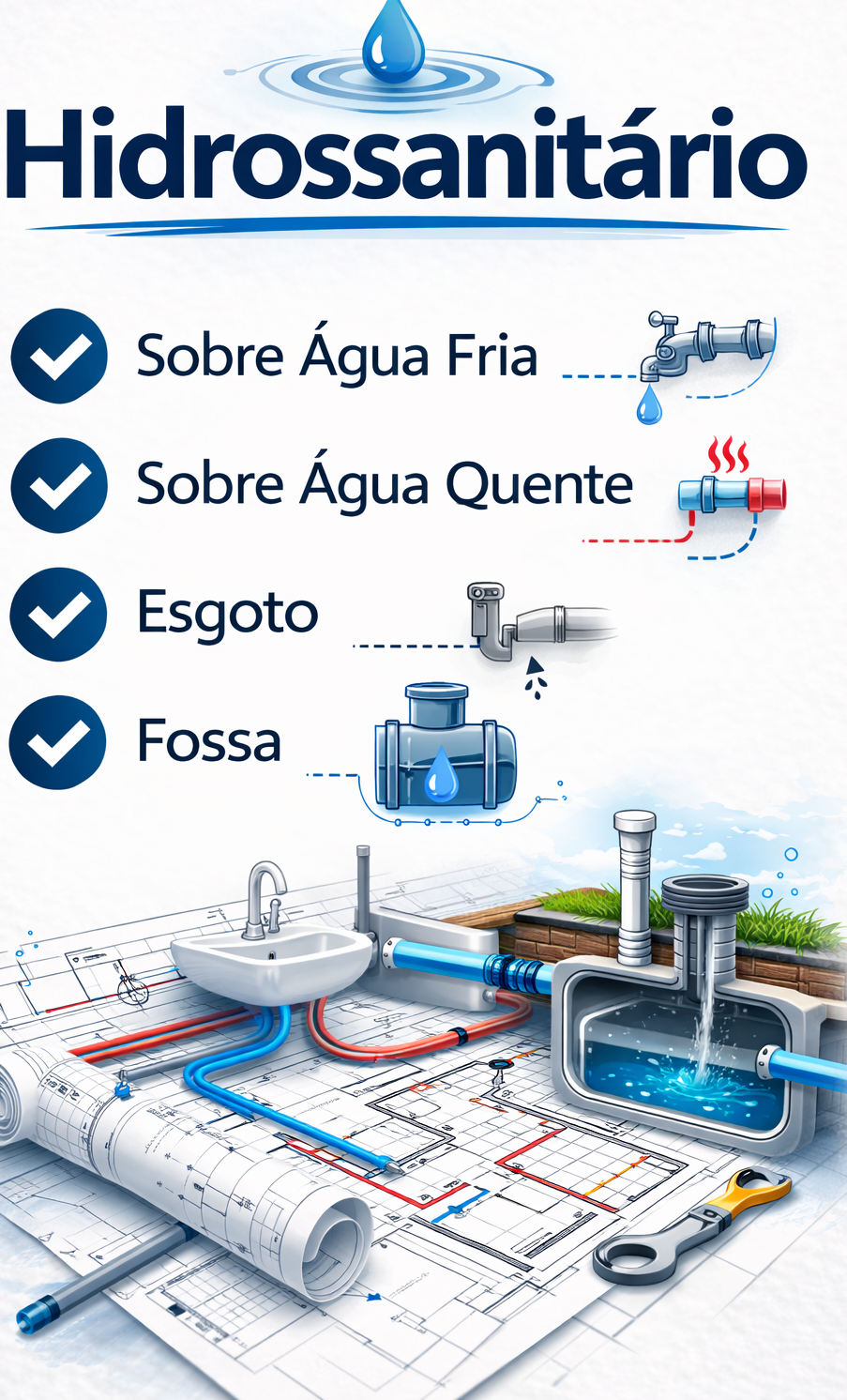 O Projeto Hidrossanitário define toda a rede de água fria, água quente e esgoto da construção. Ele indica o posicionamento e o dimensionamento correto das tubulações, caixas e demais componentes, seguindo as normas técnicas para garantir eficiência e durabilidade.